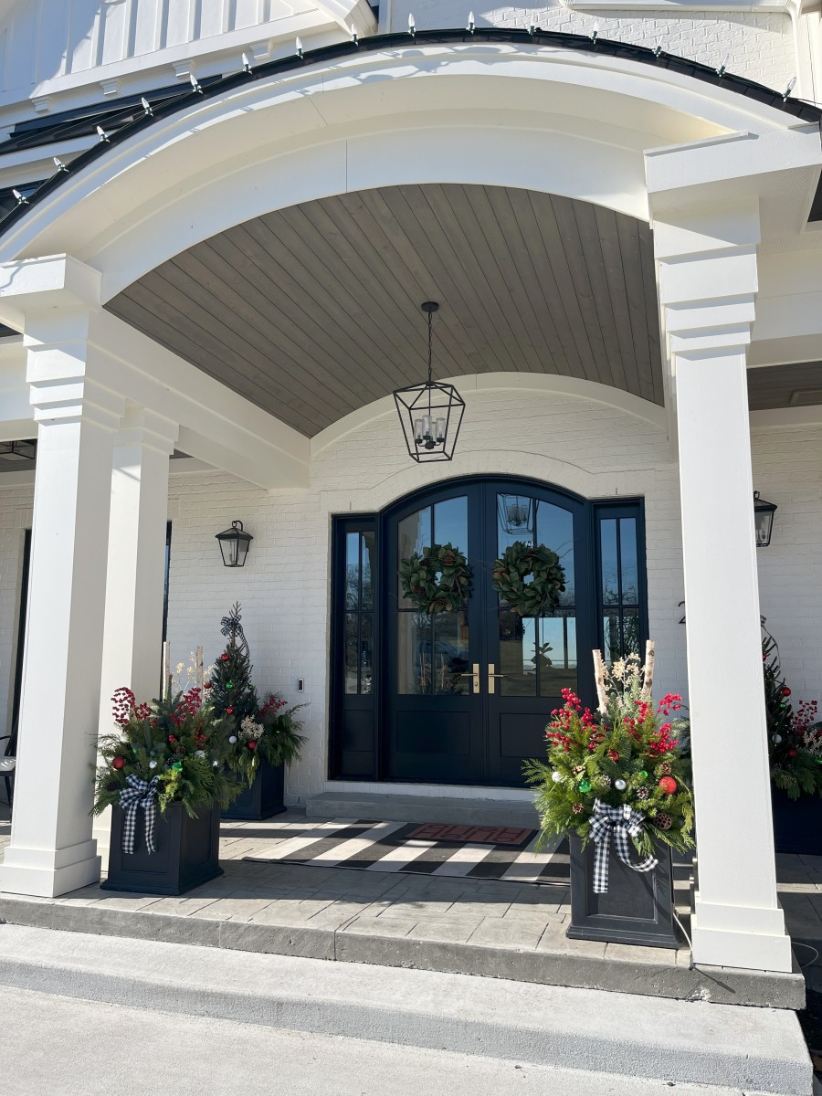 Set the stage for holiday magic with a warm and welcoming front porch. Use oversized lanterns, pre-lit garlands, and wreaths adorned with red bows or neutral tones for a modern touch. Add a cozy bench with plaid throws and pillows, and don’t forget the twinkle lights to make your custom home stand out in the evening.