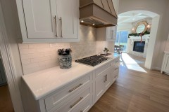 Even the kitchen can join the festivities! Decorate the range hood with a small wreath or garland. Add pops of holiday color with festive dishware, towels, and mugs. Fill jars with treats like candy canes or gingerbread cookies for a practical yet decorative touch. Use the open shelving and pantry shelves to display seasonal serving pieces or additional holiday-themed décor.