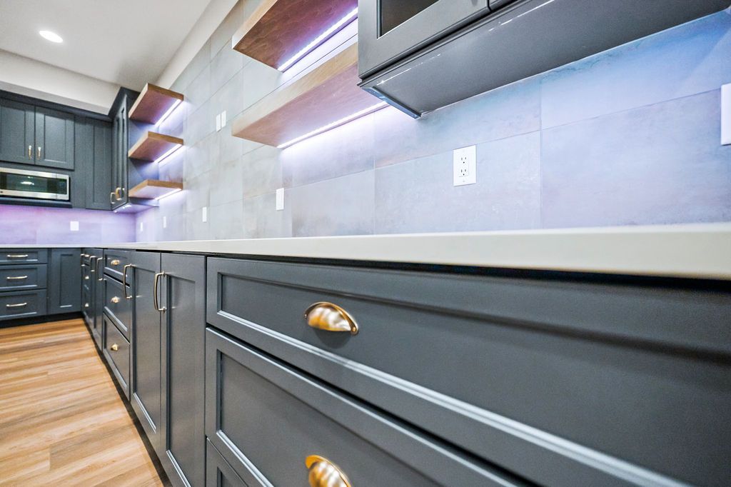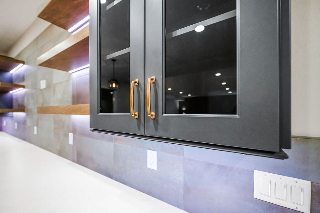 The lower level bar at Heartland Haven with integrated lighting and copper penny backsplash.