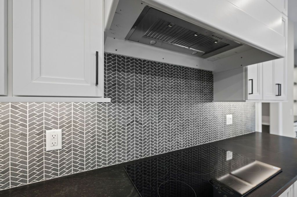 • Gray herringbone mosaic backsplash