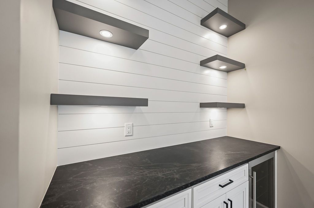 Downstairs, the finished lower level expands the home’s entertaining potential with a large recreation room. A Tricorn Black shiplap accent wall anchors the TV space, while a custom built-in bar with sink, dark cabinetry, and floating shelves creates the perfect setup for hosting game nights or family gatherings. Durable LVP flooring keeps the space practical and stylish.