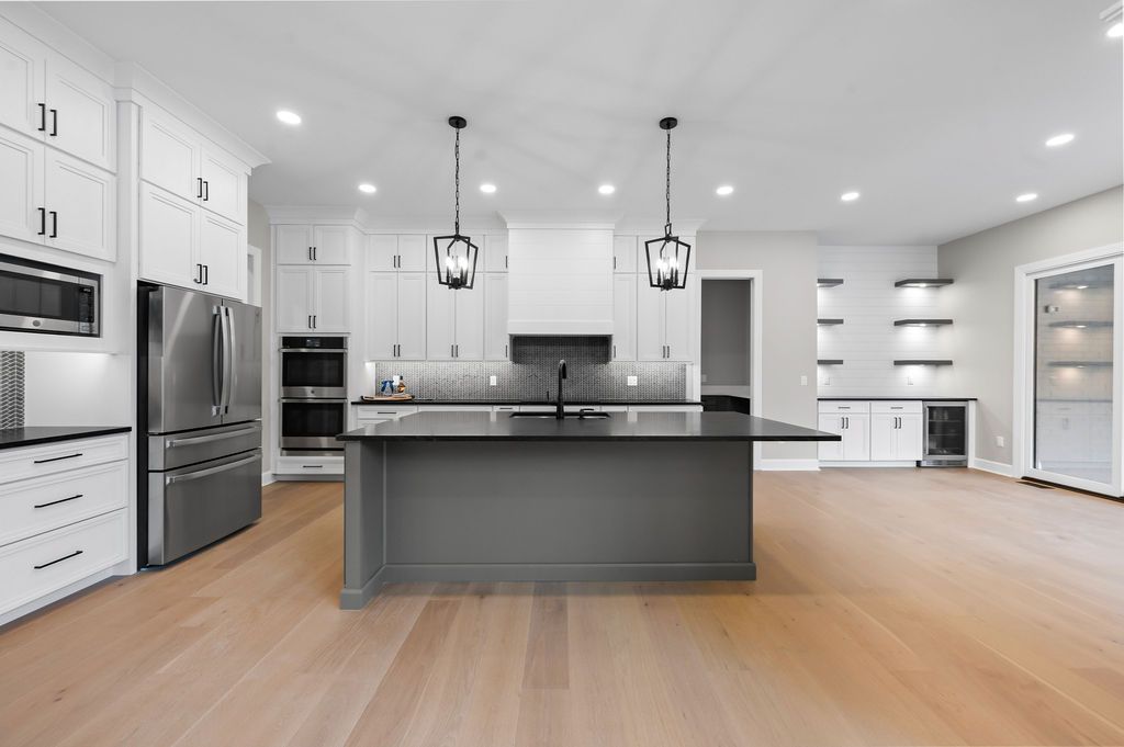 Inside, the design balances traditional architectural details with clean, modern finishes. Engineered hardwood floors run throughout the main level, creating warmth and continuity. Wainscoting, arches, and custom built-ins add timeless character, while streamlined fixtures and thoughtful lighting keep the home feeling fresh and current.