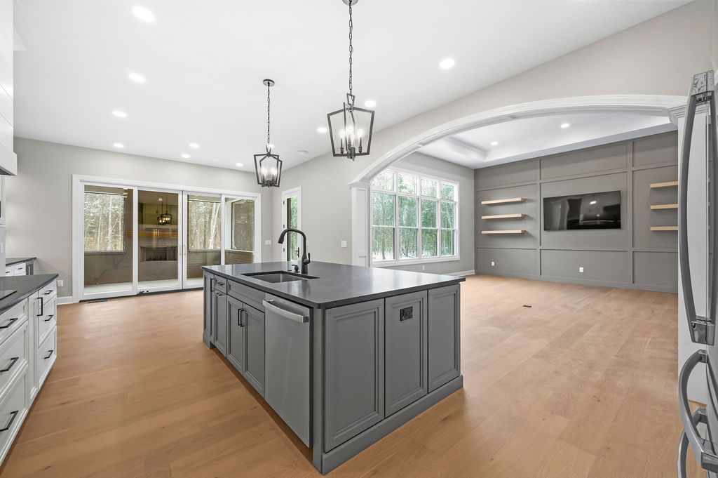 One of the homeowners’ must-haves, a traditional archway frames the transition into the great room. From the moment you step inside, your eye is drawn straight through the home to the wooded backyard, creating a beautiful connection to nature.