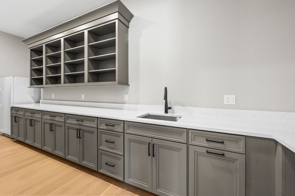 Just behind the kitchen, a pass-through pantry offers additional kitchen storage with adjustable shelving, lower cabinetry, and a sink, connecting conveniently to both the kitchen and the garage hallway.
