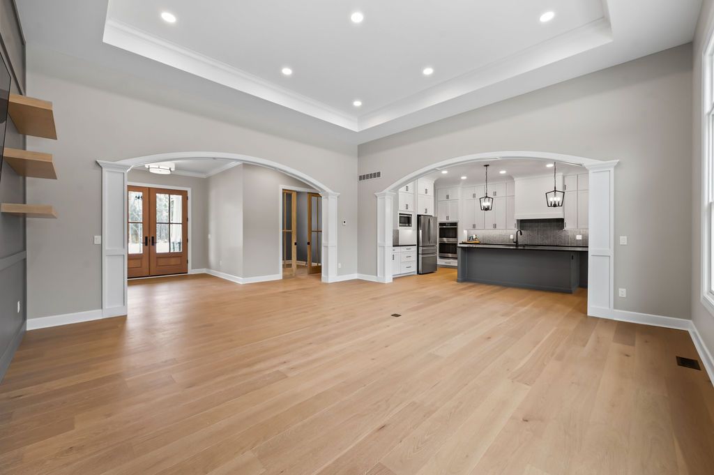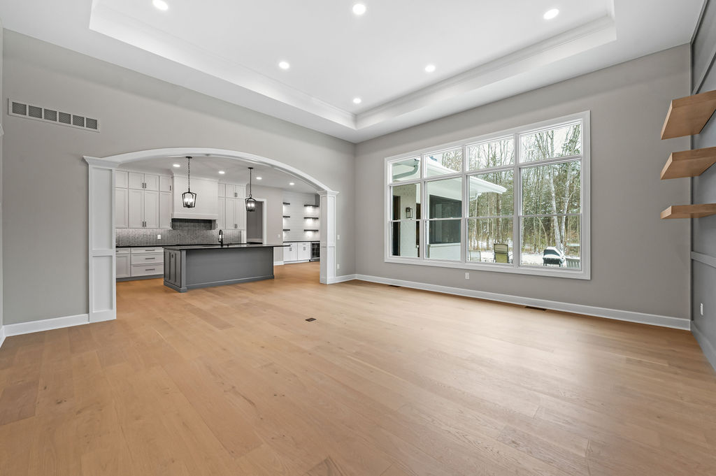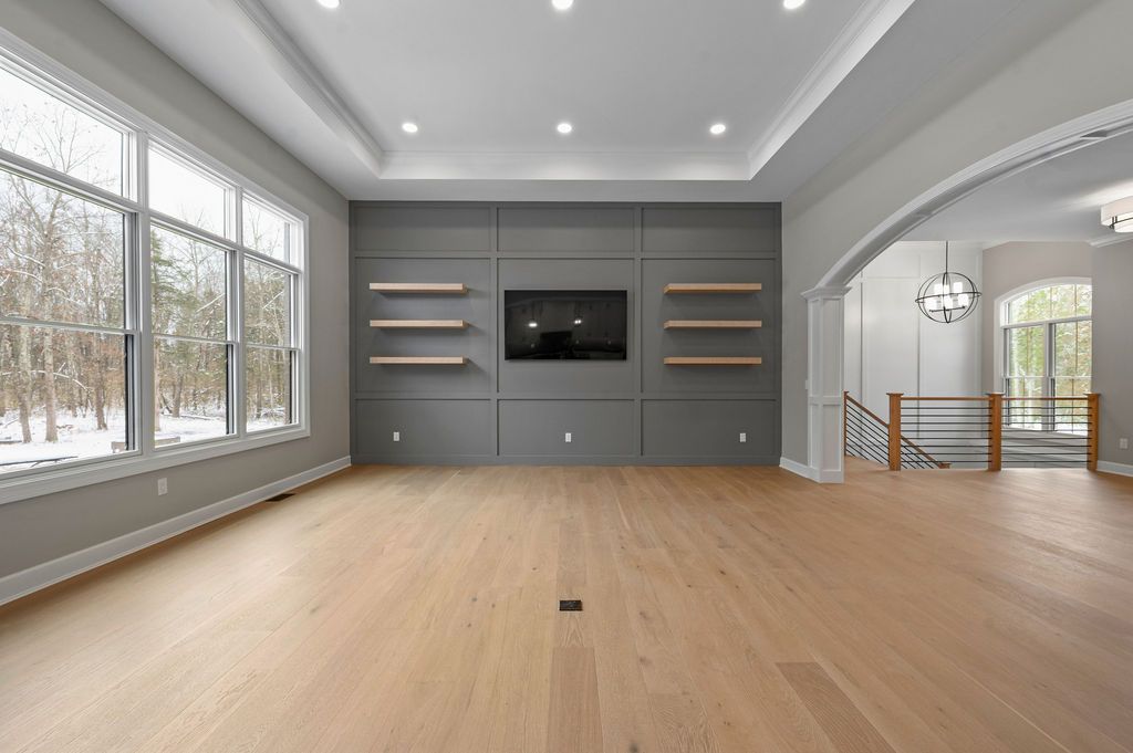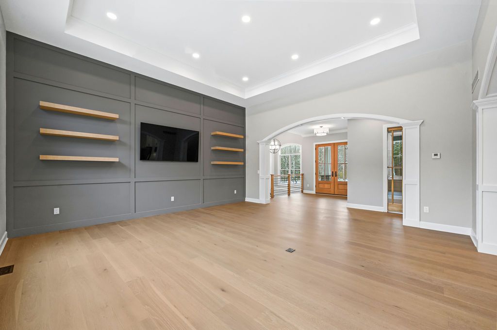 The great room was designed as the heart of the home. A tray ceiling adds dimension overhead, while a wainscoted TV feature wall with floating modern wood shelves brings texture and style.