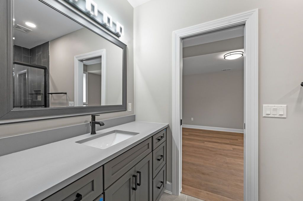 Two additional bedrooms with walk-in closets share a Jack-and-Joe bathroom with gray cabinetry, dark tile, quartz countertops, and black hardware.