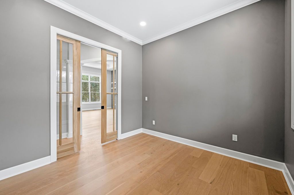 Off the entry, a private home office features hidden sliding double wood doors with glass, allowing the space to feel open when desired and secluded when needed.
