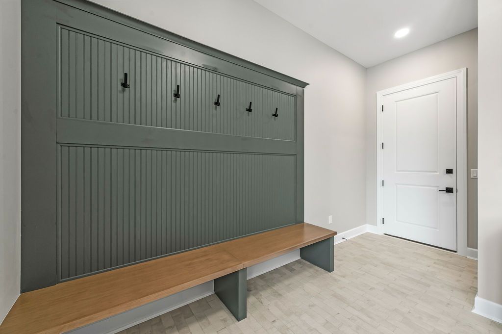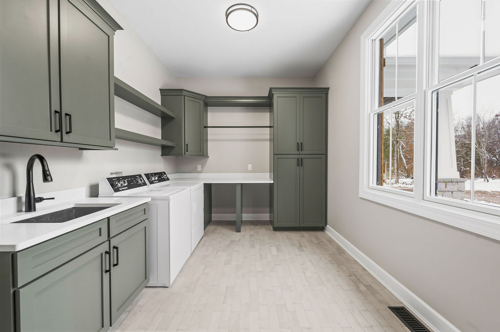 The laundry and mudroom was designed with durability and organization in mind. Custom green-stained cabinetry, a built-in bench with hooks and a wood top, and a staggered brick-lay floor create a stylish yet hardworking drop zone. A window fills the space with natural light.