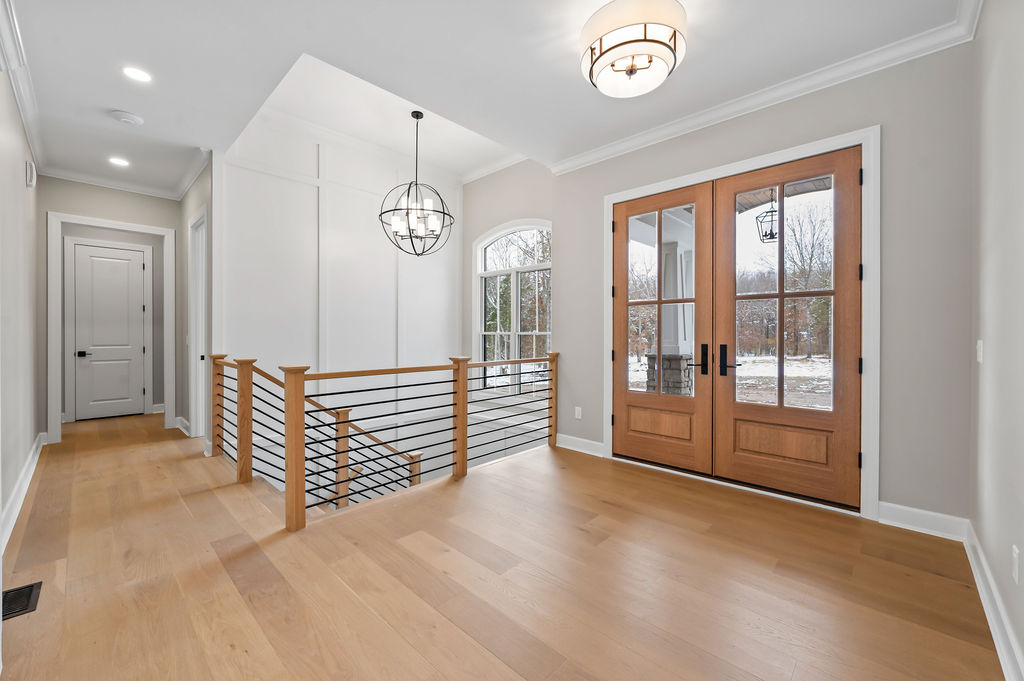 The entry immediately sets the tone. An open stairwell with black metal balusters and a craftsman wood handrail leads to the lower level, while a feature wall with classic wainscoting adds architectural interest.