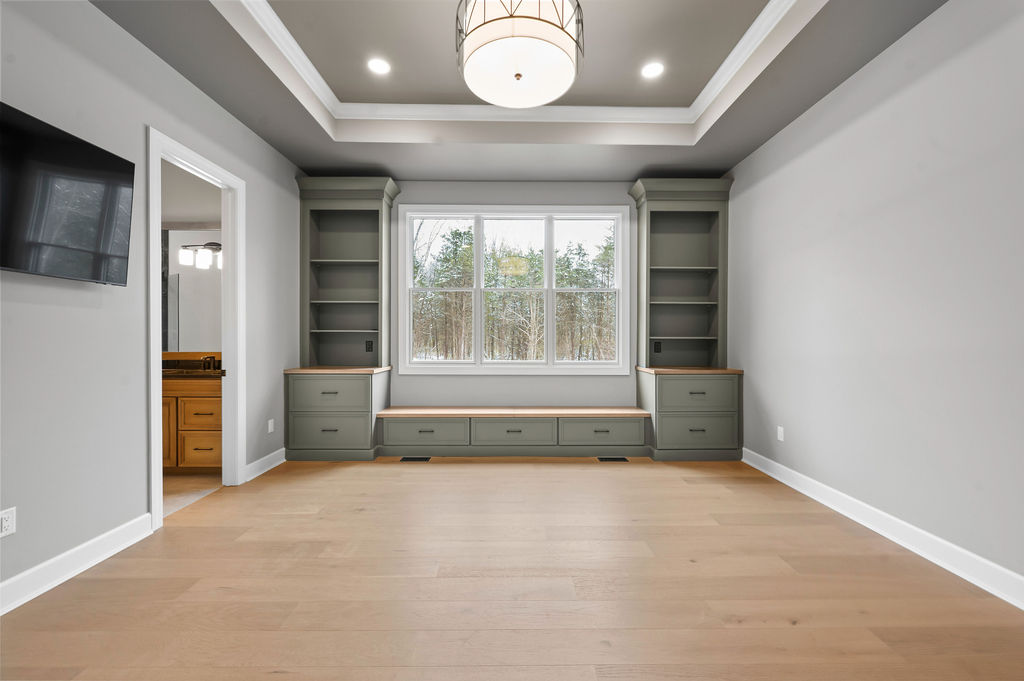 The primary bedroom offers a peaceful escape with a tray ceiling and custom green built-in bookcases flanking a window seat with drawers for hidden storage.